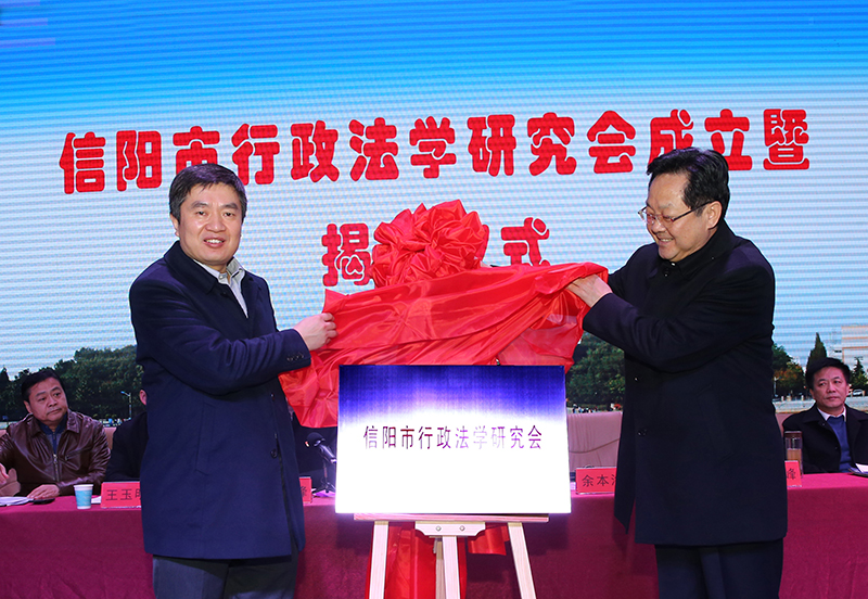 在热烈的掌声中,詹玉峰、余本海共同为信阳市行政法学研究会揭牌。