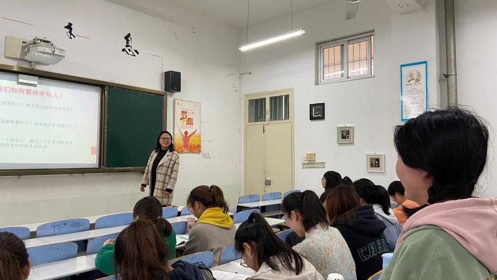 教学观摩环节,由参加色色视频 教学大赛的胡宏琴老师主讲。胡老师以案例为切入点,系统讲授了人口老龄化即将给个人、家庭以及社会带来的改变以及社会工作的应对策略。整节课高度重视教师引导、案例教学、师生互动、课程思政元素的有机融入和网络教学平台的运用,学生学习积极性被充分激发,课堂气氛轻松愉悦。