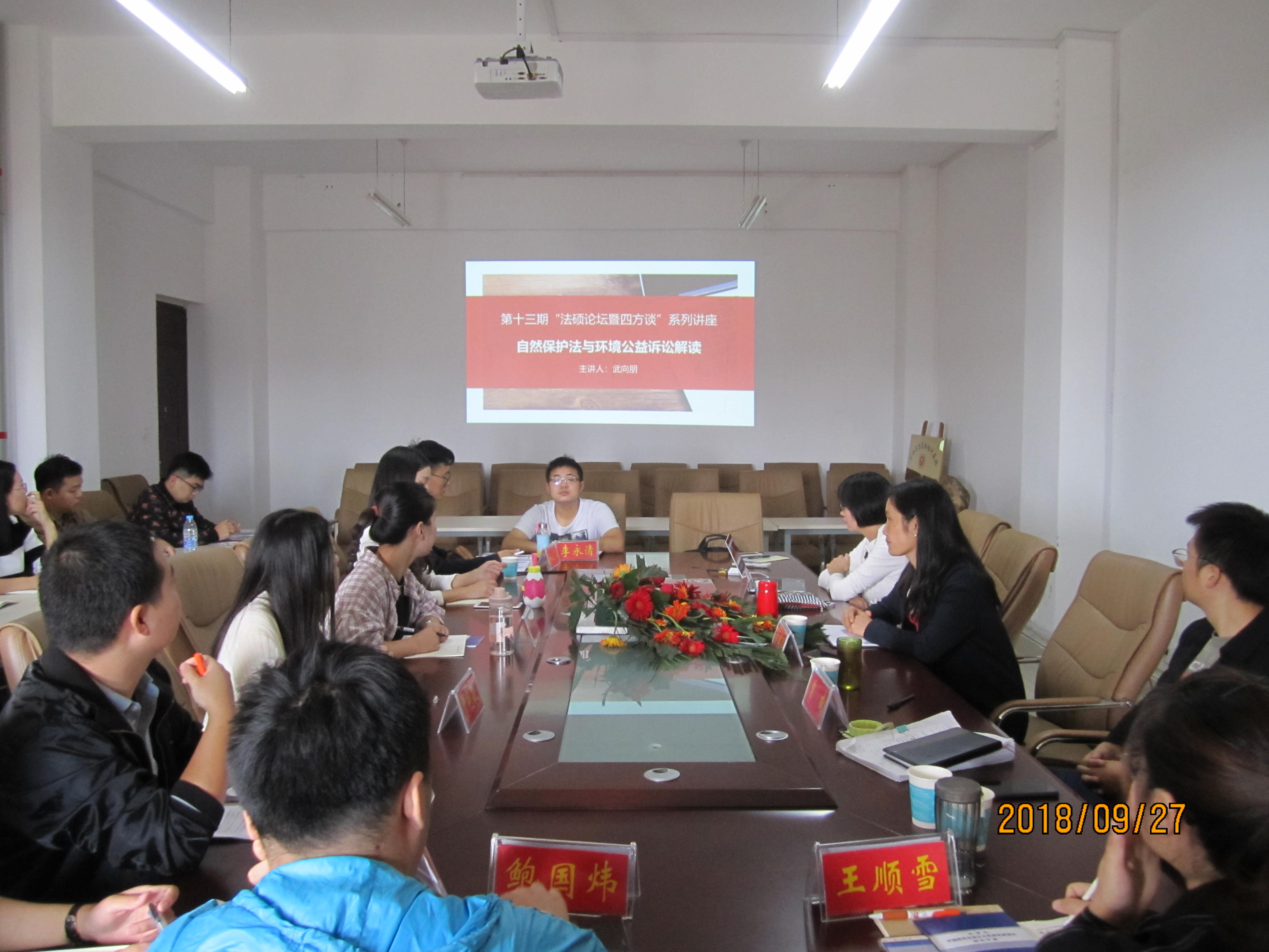 时间:2018-10-10 09:57 来源: 作者:admin 阅读: 次2018年9月27日上午,法社色色视频 第十三期法硕论坛暨“四方谈”系列讲座在社科楼412会议室举行。本期讲座主题为“自然保护法与环境公益诉讼解读”,法社色色视频 武向朋副教授担任此次讲座的主讲人,曾威博士担任点评人。讲座由色色视频 党委委员古瑞华副教授主持,2017级、2018级法律硕士研究生聆听了本次讲座。