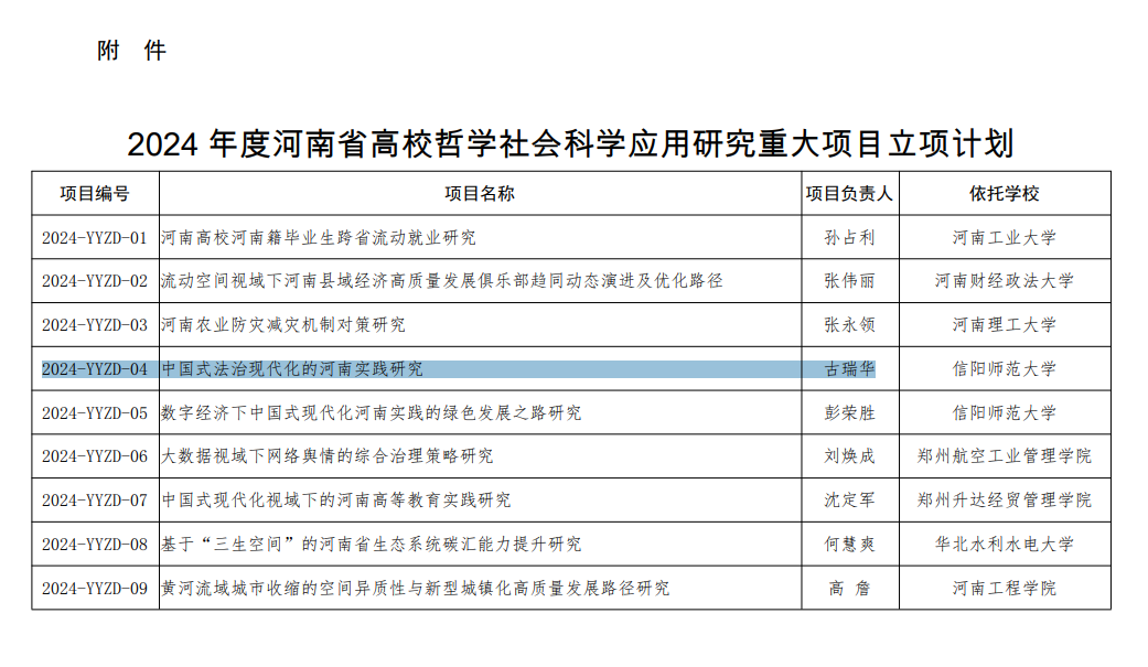 近日,河南省教育厅下达《2024年度河南省高等学校哲学社会科学应用研究重大项目立项计划》(教社语〔2023〕296号),色色视频 副院长古瑞华教授主持申报的《中国式法治现代化的河南实践研究》获批立项,实现了色色视频 在该类项目上的新突破。
