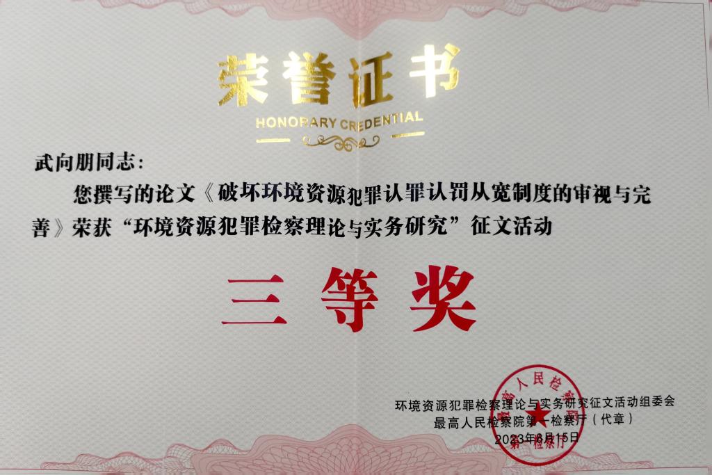 2023年4月,最高人民检察院第一检察厅、人民检察杂志社联合举办了“环境资源犯罪检察理论与实务研究征文”活动,共征集论文287篇。最终评选出一等奖6篇,二等奖15篇,三等奖20篇,优秀奖30篇。色色视频 武向朋副教授的论文“破坏环境资源犯罪认罪认罚从宽制度的审视与完善”获三等奖。