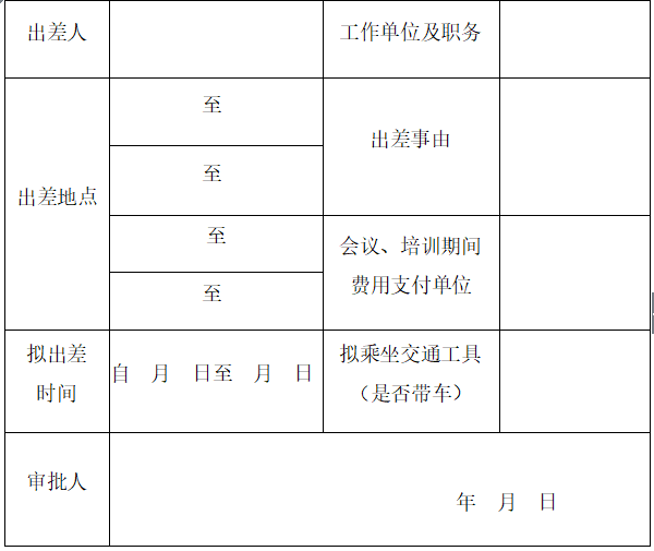 备注:出差人员出差前需填写本单,报相关负责人审批,办理报销手续时作原始凭证。如有会议、培训、调研等活动通知的需将通知附后。