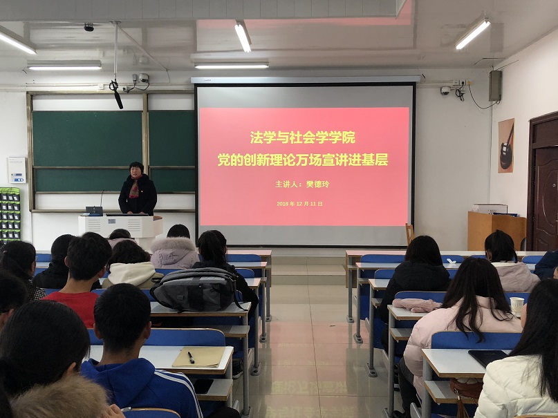 时间:2018-12-11 18:20 来源: 作者: admin 阅读: 次12月11日,法社色色视频 在社科楼517教室开展了第四场“党的创新理论万场宣讲进基层”活动,法社色色视频 党委副书记樊德玲担任主讲人。2018级全体同学参加活动。