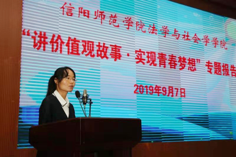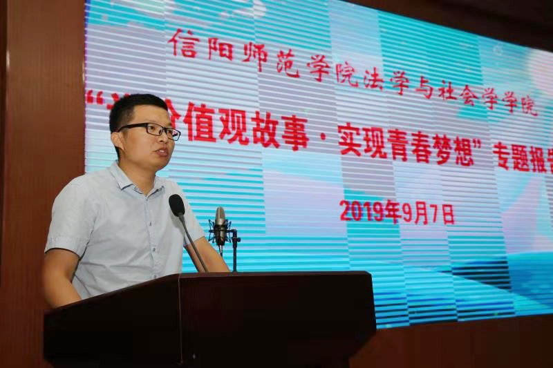 李蕊以“梅生苦寒、溢人清香”为题,讲述河南省优秀教师、我校“建校功勋”刘梅生30年如一日追求进步、矢志不渝终圆党员梦的故事,生动诠释了“三寸粉笔,三尺讲台系国运;一颗丹心,一生秉烛铸民魂”的师者风范。张涛以“感恩•遇见”为题,讲述自己从豫南信阳走进首都北京、从求学师院到任职国务院参事室的成长经历,抒发了爱国爱党、爱校爱家的赤子情怀,激励新生立鸿鹄志、做奋斗者,用感恩照亮前行之路、用实干成就青春梦想。肖阳以“奋斗的青春最美丽”为题,讲述在我校和西安交通大学求学期间孜孜不倦、终有所成的亲身经历,勉励2019级新生发扬“厚德崇实、善学敏行”的校训精神,努力做一个勤奋、有情怀、全面发展的新时代优秀大学生。