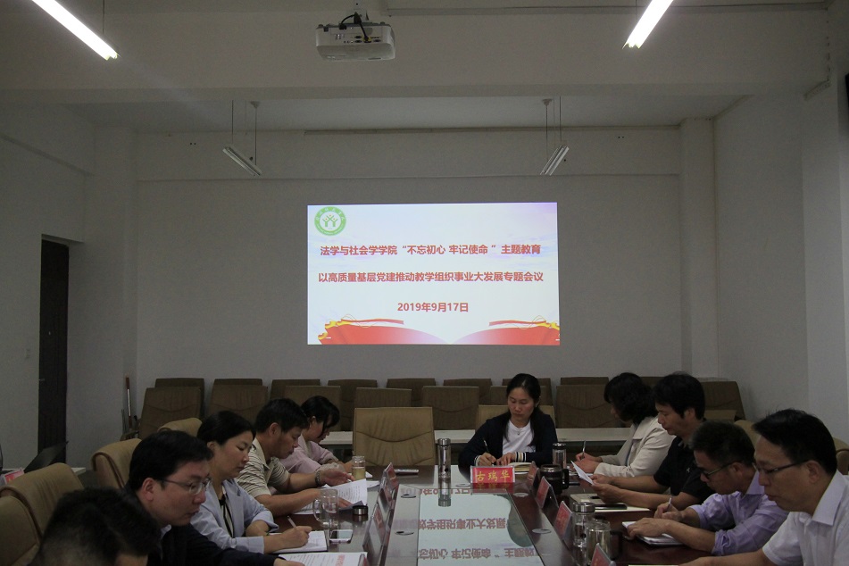 王文华在总结讲话中指出,“不忘初心、牢记使命”主题教育——以高质量基层党建推动教学组织事业大发展专题会议,既是法社色色视频 “不忘初心、牢记使命”主题教育工作动员部署会,也是一场以高质量基层党建推动教学组织教学、科研大发展专题会议。希望各支部、各教学组织按照“守初心、担使命、找差距、抓落实”总要求,对标色色视频 《关于开展<样板党支部“五个一”工程>建设的通知》精神,不折不扣落实好主题教育各项任务,确保主题教育取得好效果。