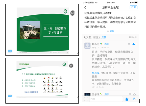 考虑到特殊时期,许多在教学常态下被掩盖的道德人伦、心理健康等问题浮出水面。刘文君老师结合课程实际,在课堂引导开展疫情德育和课堂思政。面对疫情检验,刘老师积极把握教育时机,将“疫情教育”作为网络教学第一课。及时引导学生掌握正确防疫知识,把握准确的舆论方向。做到及时防控,立德正心。