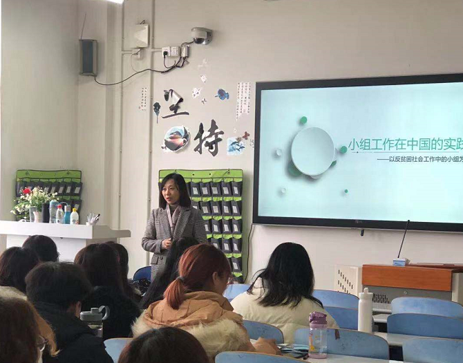 观摩课上,蔡瑾老师以反贫困社会工作中的小组为例对小组工作在中国的实践进行了深入浅出的讲解。蔡老师介绍了我国贫困救助工作和反贫困社会工作的开展情况, 通过“云南平寨的少数民族扶贫项目”和“云南小额信贷扶贫计划”两个典型案例,重点讲述了反贫困社会工作的实践路径。