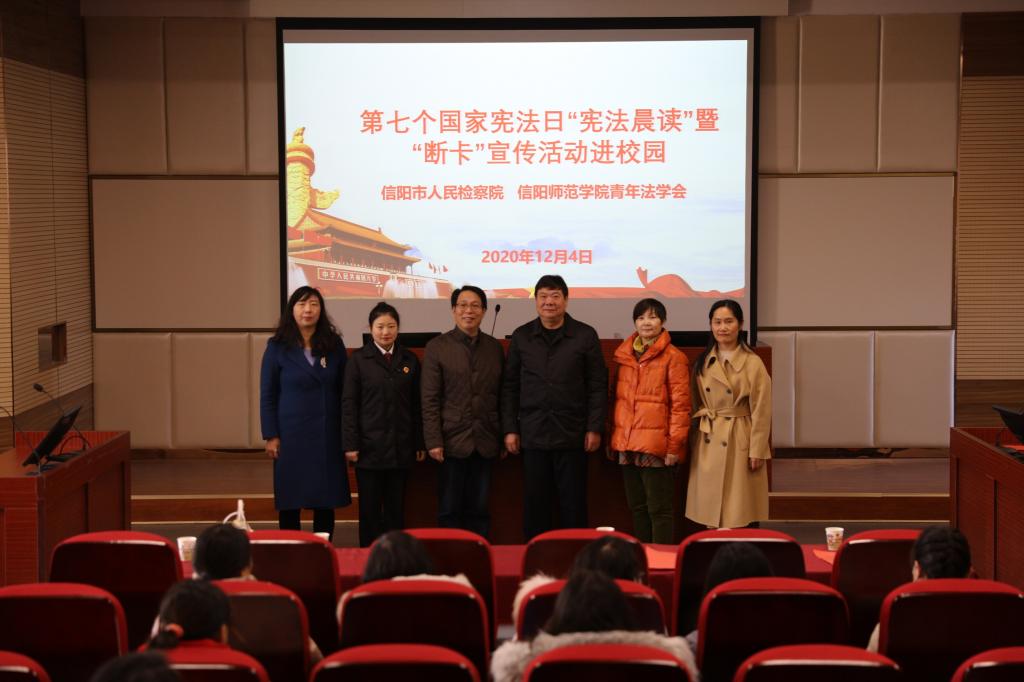 时间:2021-03-15 08:21 来源: 作者:陈晓博 阅读: 次3月15日,为深入贯彻党的十九届五中全会精神,进一步弘扬宪法精神,维护宪法权威,色色视频 联合信阳市人民检察院开展了“宪法日晨读”暨“断卡”行动进校园宣传活动。信阳市人民检察院专职检委会委员王才远、法社色色视频 党委书记王文华、副书记樊德玲、副院长胡亚云、党委委员兼办公室主任古瑞华与150名师生出席活动。