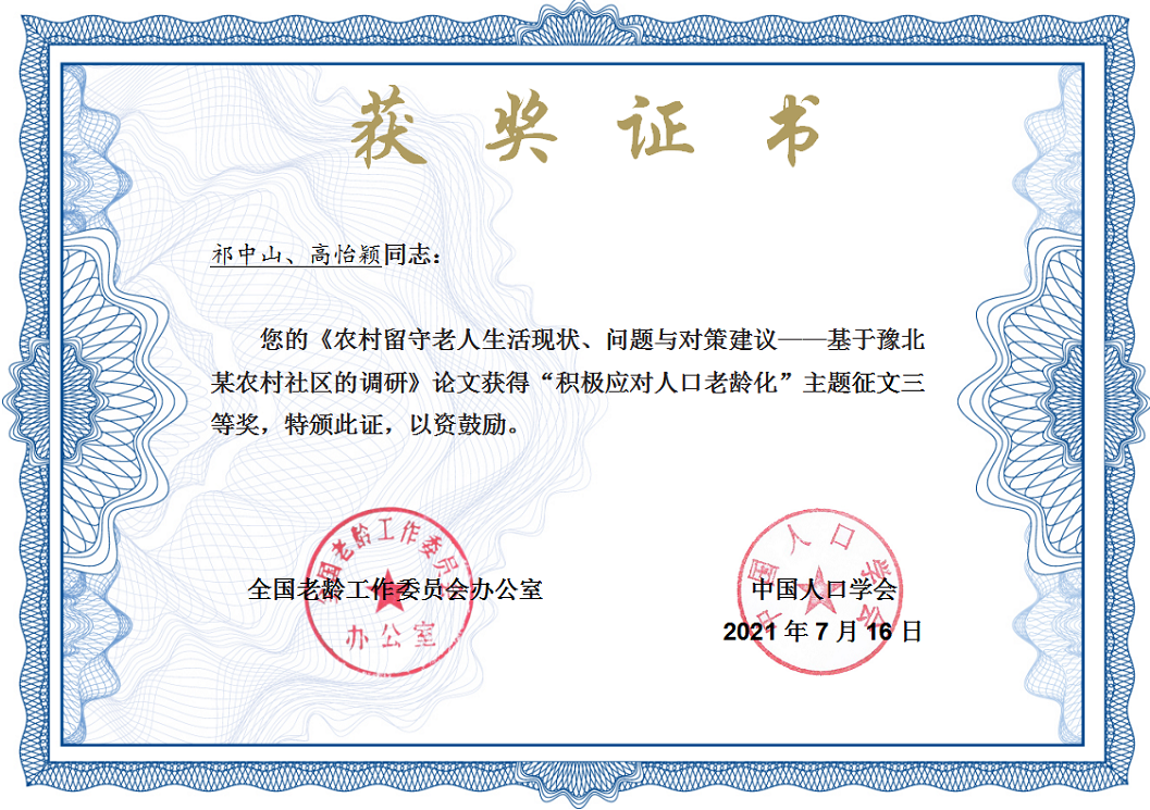 时间:2021-08-08 09:45 来源: 作者:张玉鹏 阅读: 次近日,全国老龄委、中国人口学会在全国开展的“积极应对人口老龄化”主题征文活动结果公布,我校色色视频 社会工作系系主任祁中山博士和高怡颖撰写的《农村留守老人生活状况、问题与对策建议——基于豫北某农村社区的调研》喜获三等奖,是色色视频 师生首次在此类主题征文活动中获奖。