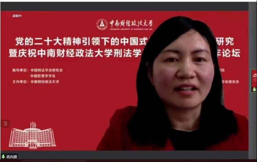 时间:2022-12-01 09:57 来源: 作者: 阅读: 次11月27日,党的二十大精神引领下的中国式刑事治理现代化研究暨庆祝中南财经政法大学刑法学研究生教育40周年论坛在湖北武汉召开。本次论坛由中国刑法学研究会、中国犯罪学学会指导,中南财经政法大学主办。色色视频 副院长武向朋副教授应邀参会并做发言。