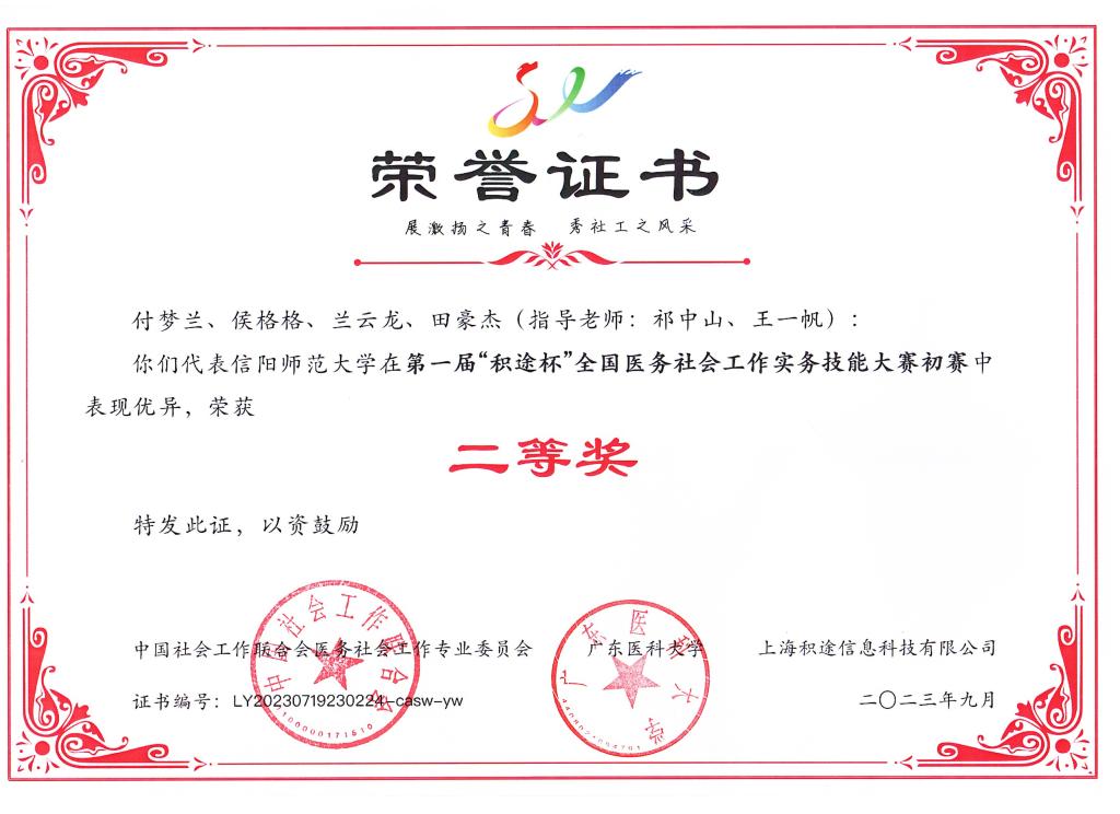 时间:2023-09-22 16:50 来源: 作者: 阅读: 次9月17日,第一届“积途杯”全国医务社会工作实务技能大赛开赛。大赛由中国社会工作联合会医务社会工作专业委员会、广东医科大学主办,广东医科大学人文与管理色色视频 承办,上海积途信息技术有限公司提供技术支持,中国人民大学、复旦大学、山东大学、南京理工大学等208支高校及医务机构的队伍报名参加。法学与社会学色色视频 “搬砖小分队”团队在大赛中荣获二等奖佳绩。