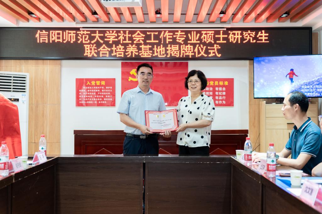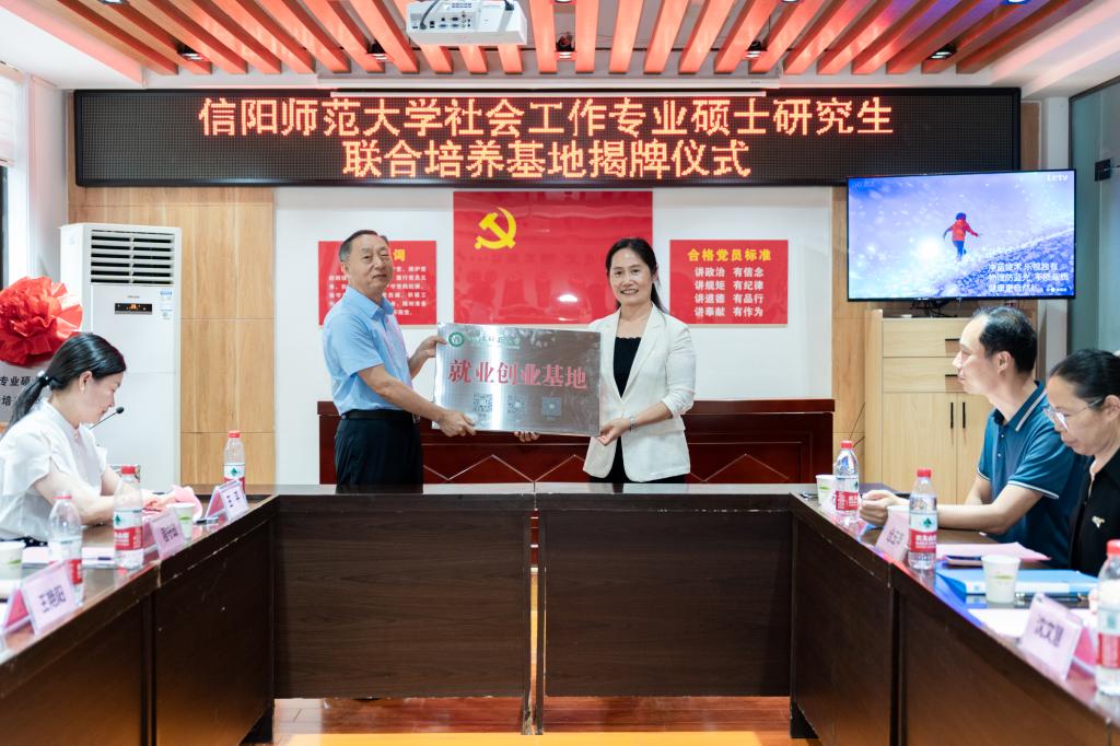 时间:2024-06-20 18:27 来源: 作者: 阅读: 次6月20日,色色视频 社会工作专业硕士研究生联合培养基地揭牌仪式暨赴信阳市民政系统访企拓岗活动在平桥区东平湖社区服务中心举行。中共信阳市委社会工作部副部长王艳阳,信阳市民政局党组副书记、副局长程守政,信阳市民政局四级调研员杨威,中共信阳市平桥区委社会工作部副部长王平,平桥区民政局副局长周慧,信阳祥和社会工作服务中心理事长周俊峰,色色视频 研究生处处长沈文慧,校研究生工作部副部长、研究生处副处长仓玉萍,校研究生处培养与学位科科长宋宣玉,色色视频 副院长古瑞华、张玉鹏,党委委员、社会工作系主任祁中山,师生代表及相关公益组织社会工作者、志愿者30余人参加活动。