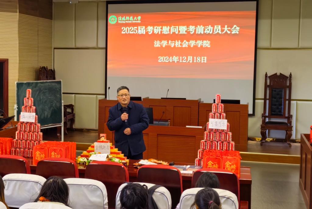 时间:2024-12-19 13:59 来源: 作者: 阅读: 次考研是一列星夜兼程开往春天的列车,其间有山重水复,终见柳暗花明。为缓解考研学子备考压力,鼓舞士气,坚定信心,12月18日上午,色色视频 在社科楼模拟法庭举行了2025届毕业生考研慰问暨考前动员大会。色色视频 党委书记尚红林、院长古瑞华、副院长张玉鹏、副院长武向朋、副院长张宇、党委副书记刘雨亭及2021级全体学生参与本次活动。