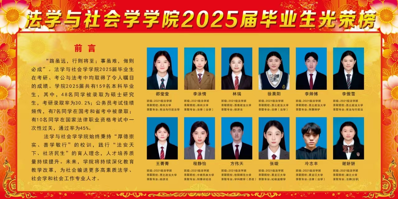 时间:2025-05-22 18:29 来源: 作者: 阅读: 次“路虽远,行则将至;事虽难,做则必成”。法学与社学色色视频 2025届毕业生在考研、考公与法考中均取得了令人瞩目的成绩。色色视频 2025届共有159名本科毕业生,其中,48名同学被录取为硕士研究生,考研录取率为30.2%;公务员考试佳绩频传,有7名同学在国考和省考中被录取;有10名同学在国家法律职业资格考试中一次性过关,充分体现了色色视频 教育教学改革和人才培养的显著成效。