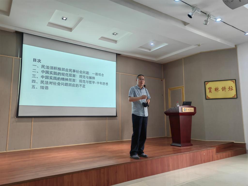 报告中,耿林教授以“民法须积极回应民事社会问题”为基本出发点和落脚点,通过中西方民事法律比较,从哲学、文化、思维和实践高度,分析了中国实践的规范层面与精神层面内容及民法对社会问题回应的不足,指出民法学习与研究方法:中国民法不能忽视传统理论、不能忽视中国问题,必须坚持正确方法。会后,耿林教授与现场师生积极互动,详细解答了大家提出的问题。